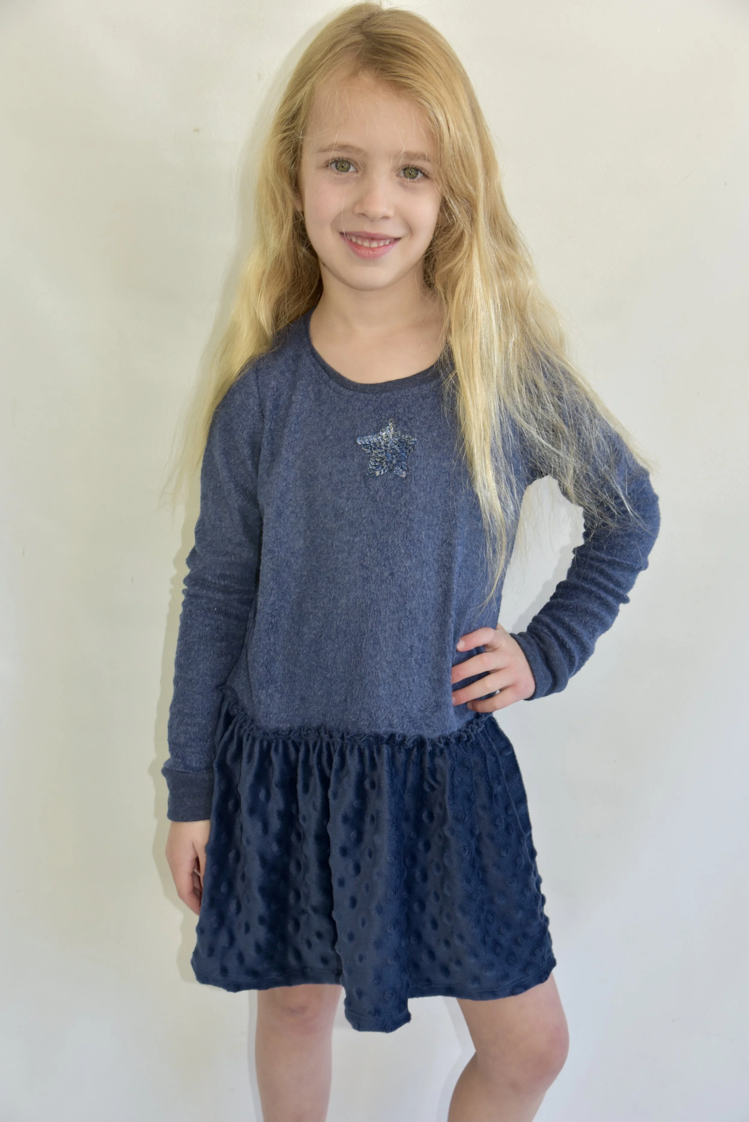 Navy Minky Drop Waist LS Dress / Navy Sequin Star