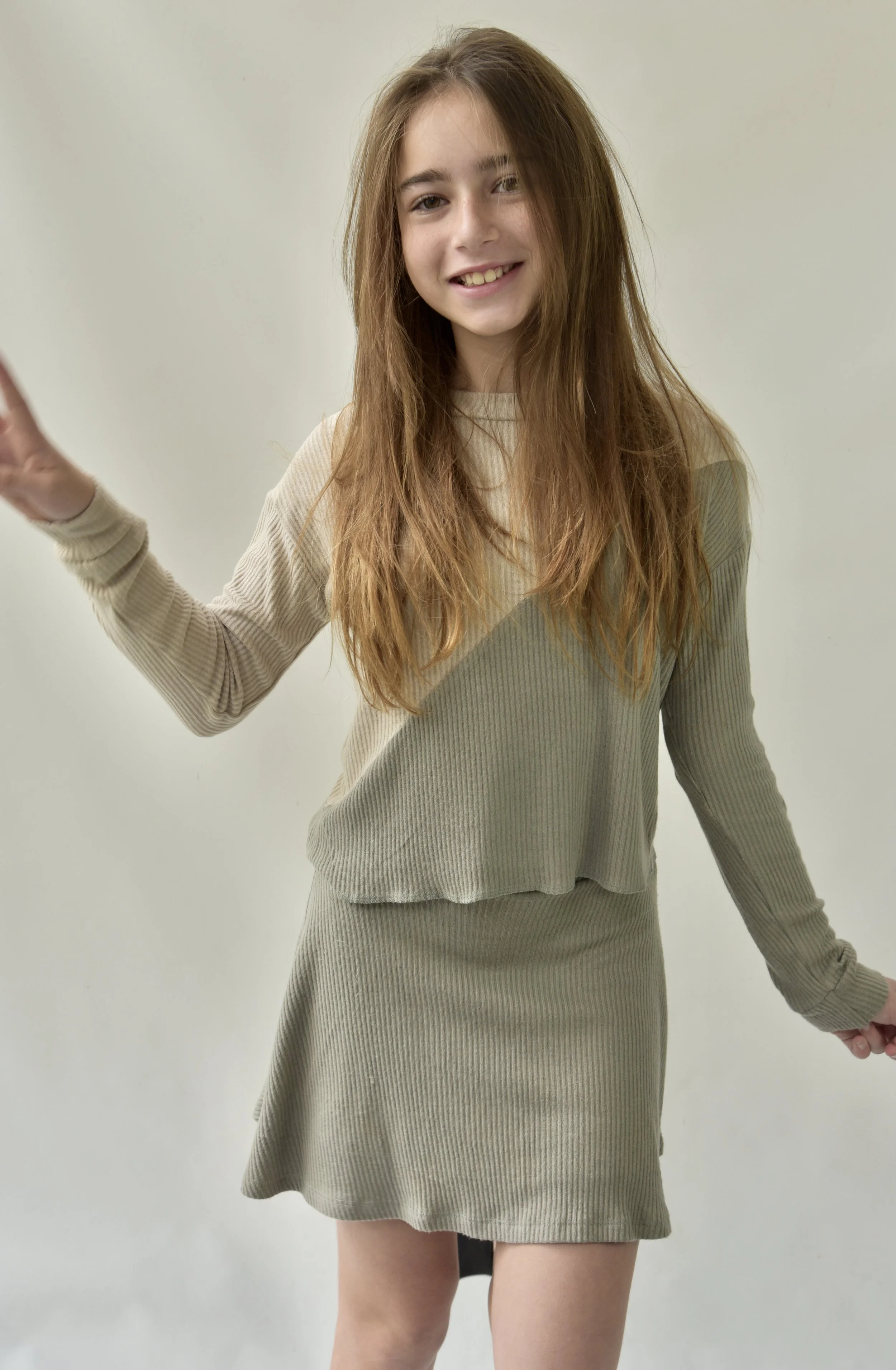 2704 Katie & 2705 RoyaltyLight Olive Modal Sweater Rib / Beige Asymetrical Sweater & Light Olive Modal Sweater Rib Circle Skirt
