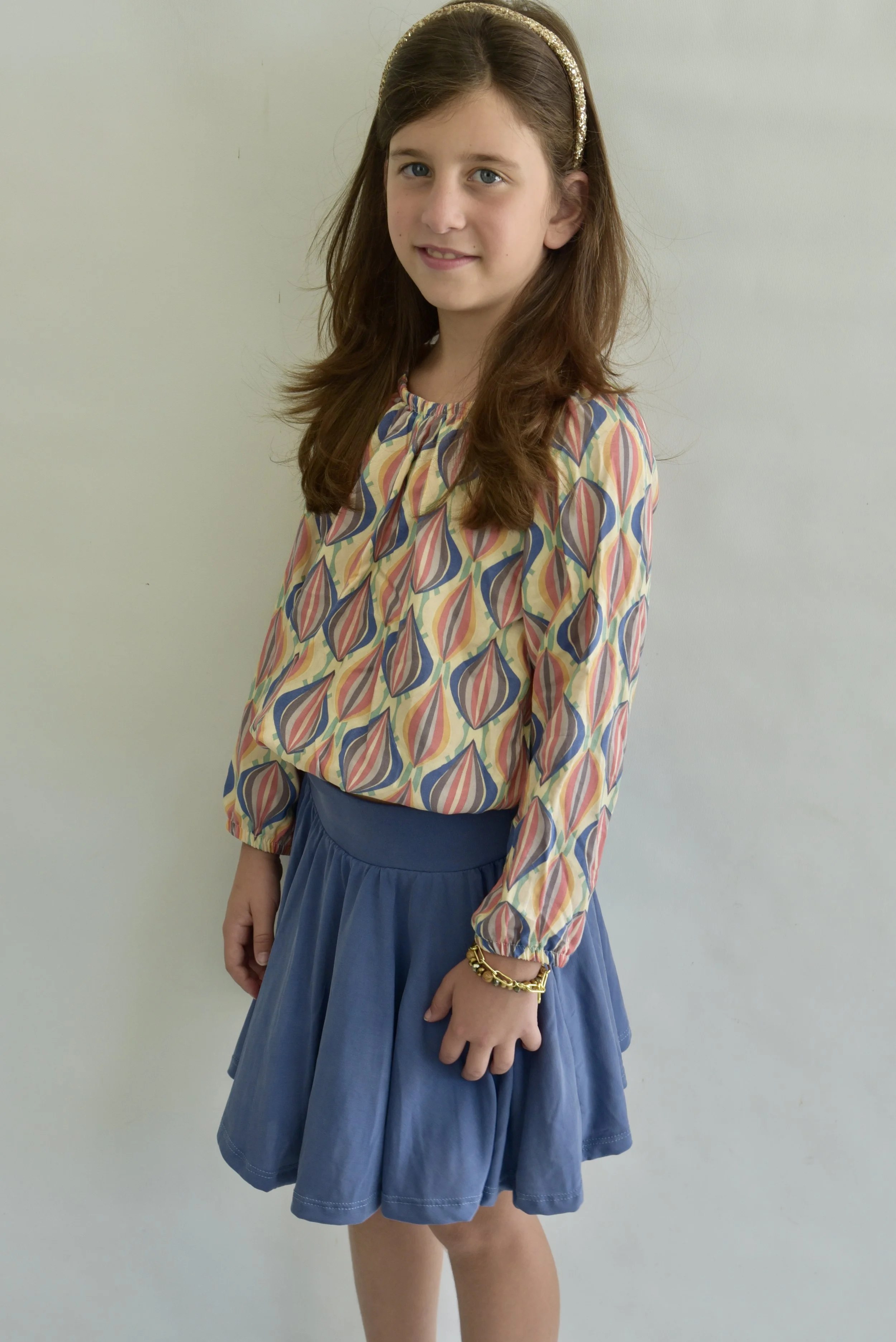 Colorful Woven Motif Elastic Neck Top & Solid Blue Knit Circle Skirt/ Lining