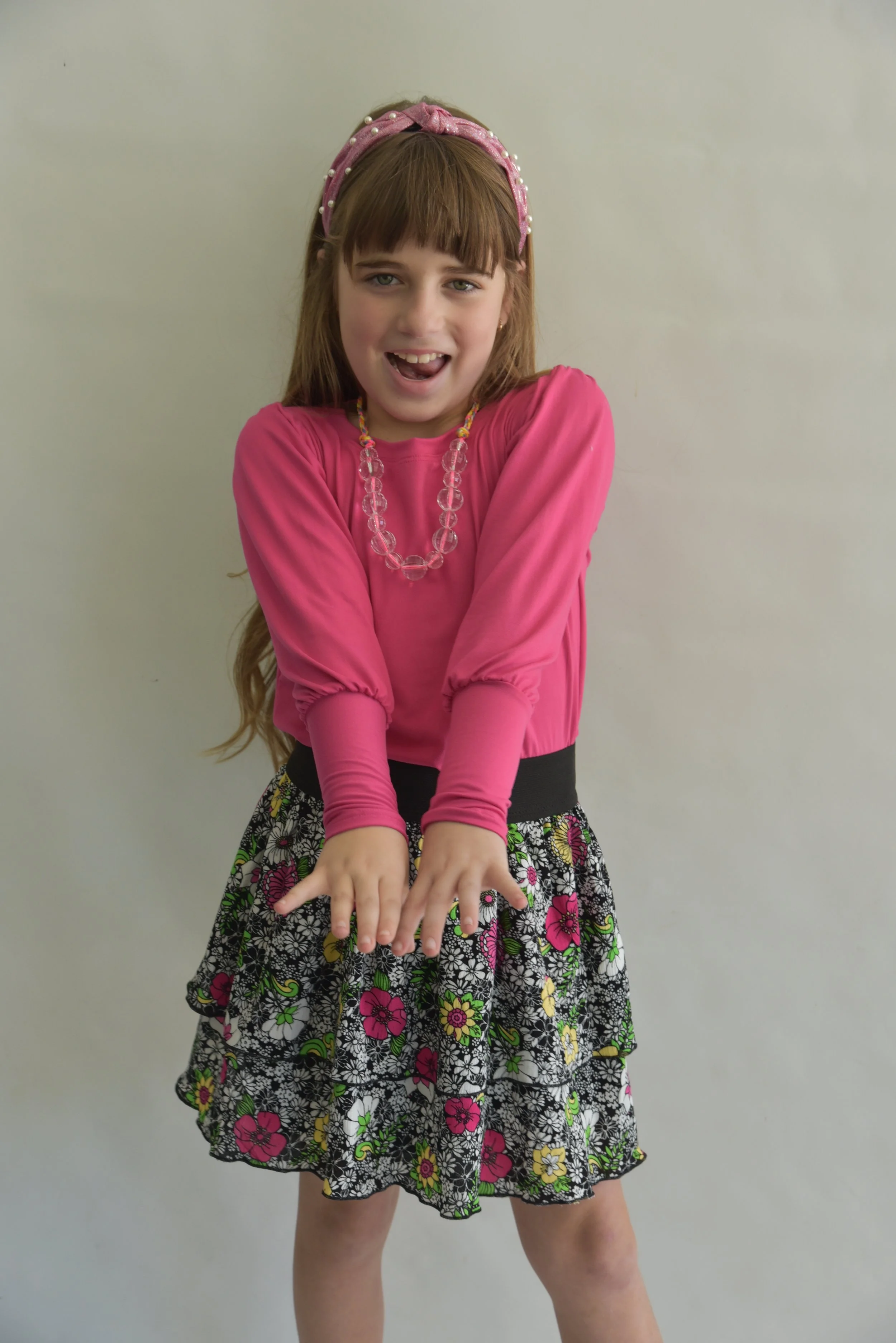 1702 Anna & 1703 CadenceFuchsia LS Top w/ Long Cuffs & Black White / Fuchsia Crepon Lined Skirt / Black Elastic Waist Band